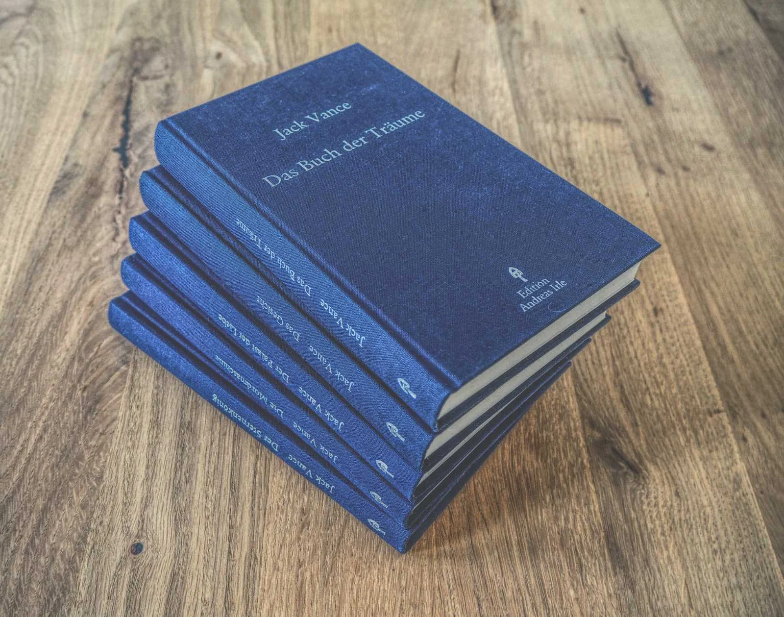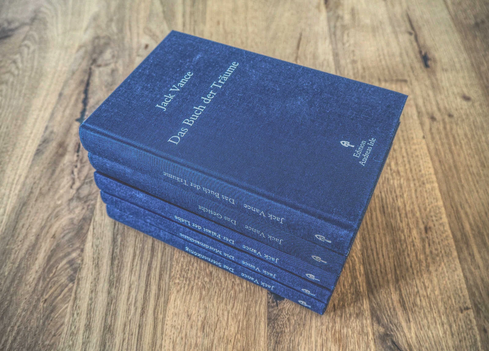 Die Ausgabe der Edition Andreas Irle entspricht der voranschreitenden Gesamtausgabe. Jeder der fünf Bände ist in dunkelblauem Leinen gebunden. Die Prägungen sind in Silber und eine Fadenheftung ist vorhanden. Leider fehlt ein Leseband. Es sind nur noch wenige Exemplare der Leinenausgabe lieferbar, gebraucht kann man sie nur zu unmoralischen Preisen erstehen. Die Übersetzung stammt von Andreas Irle.
